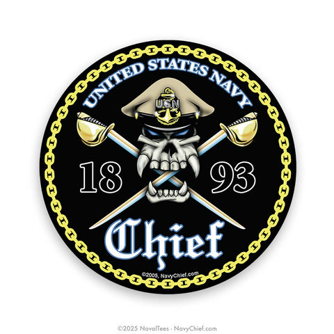 World famous "Navy Chief Skull and Crossbones" color vinyl sticker for display on outside surface, looks great on back of cars & trucks! ©2010, NavyChief.com